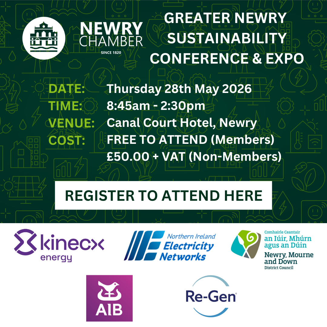 Entitled: ‘Building a Sustainable Future & The Green Economy’, the half day conference is supported by Newry, Mourne and Down District Council, Kinecx Energy, AIB, Re-Gen and NIE Networks, and will focus on the challenges and opportunities we face as a business community across the Greater Newry Area in growing our economy in a sustainable way.
